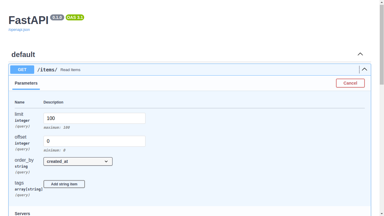 /docs의 문서 UI에서 쿼리 매개변수를 확인할 수 있습니다: