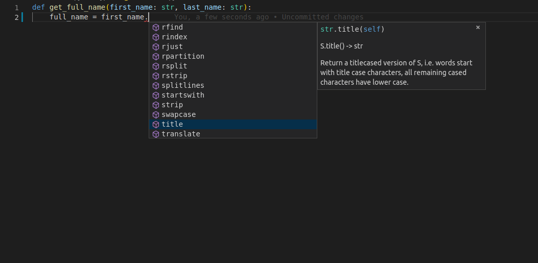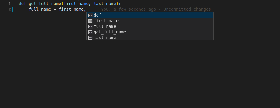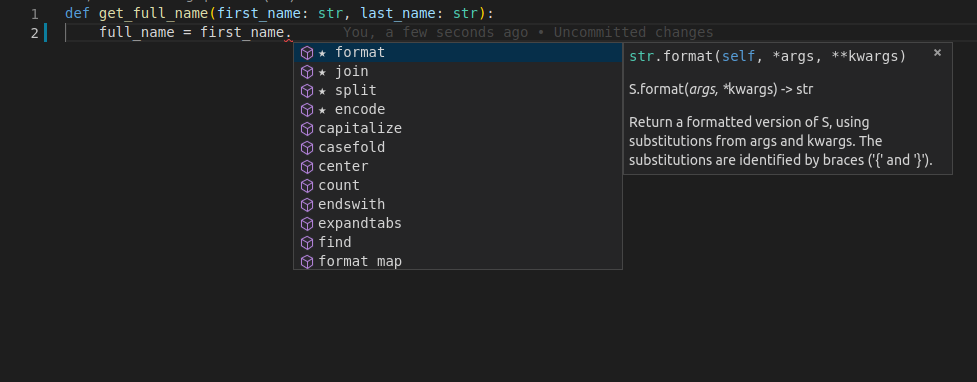 Você digita o primeiro parâmetro da função, first_name, depois um ponto (.) e, em seguida, pressiona Ctrl+Space para acionar o preenchimento automático.