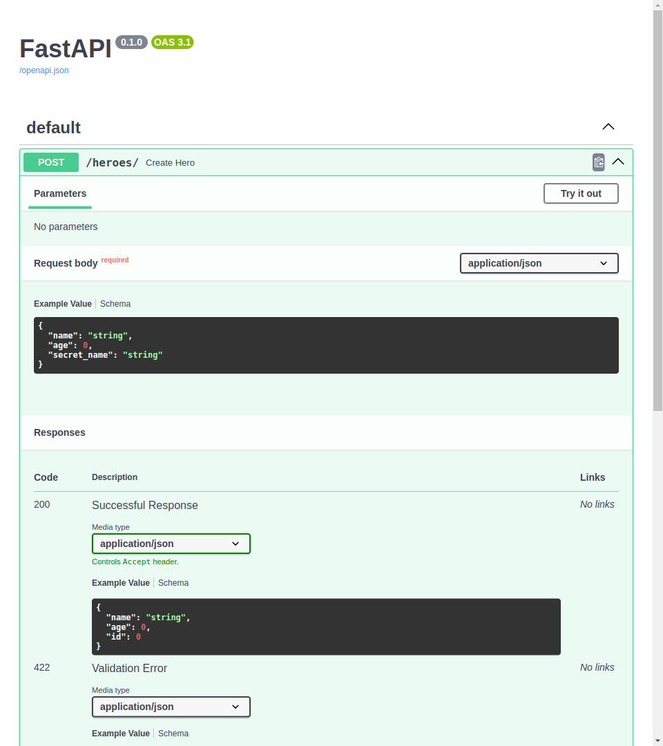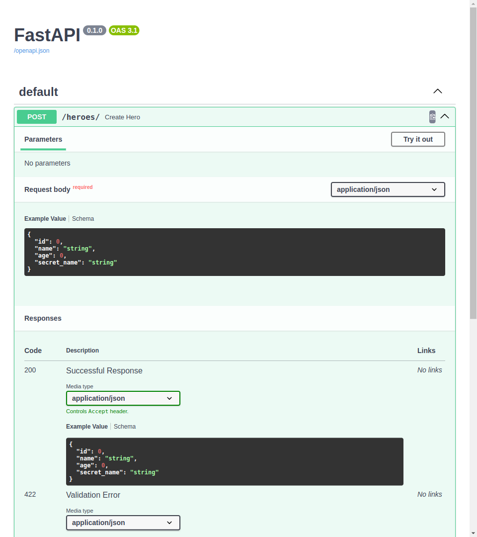 Se você for para a interface /docs da API, verá que agora ela está atualizada e não esperará receber o id do cliente ao criar um hero, etc.
