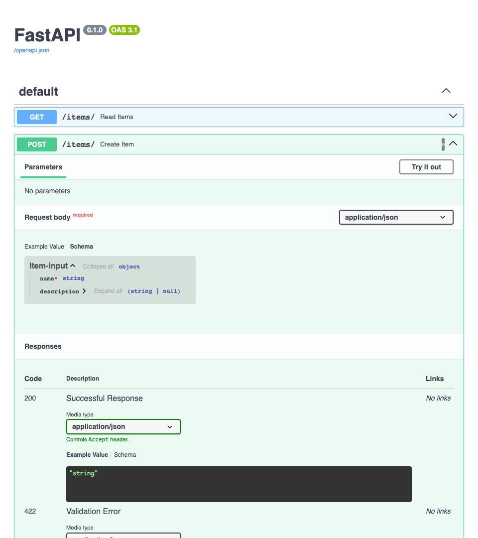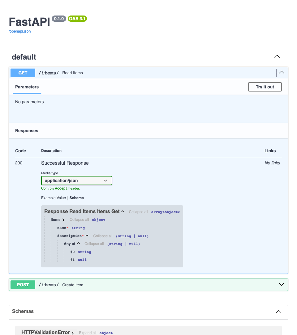 Artık model için input ve output tarafında tek bir schema olur: sadece Item. Ayrıca description alanı required değildir: